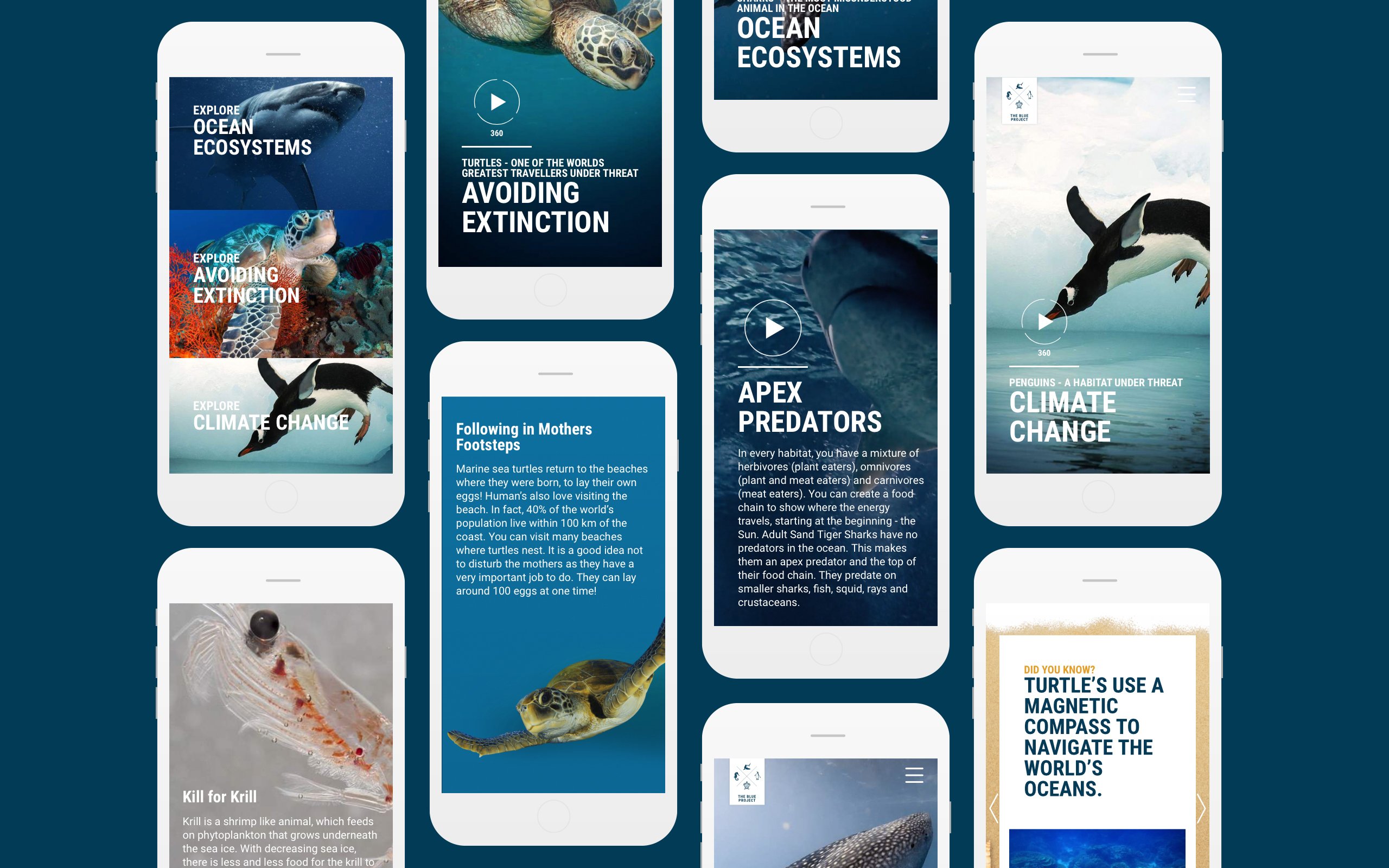 We created a series of 360° video clips for our audience to get up close an personal, to explore and experience what it is really like to be on the other side of the glass in the aquarium. Images, video and interactive elements are woven together to create a series of rich learning pieces that are punctuated by interactive sections designed to reinforce the content blocks. Each learning theme ends with three simple tasks, that the students undertake with classmates or family, empowering and inspiring them to make meaningful change.